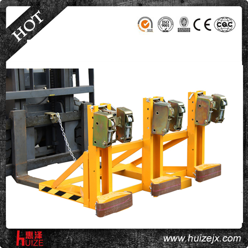 重型三油桶夾具單鷹嘴純機械機構(gòu)設(shè)計可與叉車方便地配合,僅依靠叉車的動作,不需要其它的動力,可自動一次搬運3個塑料油桶, 配置可拆換式柔性耐磨保護墊,有效保護油桶并緩沖叉車行駛過程中的震動, 能在集裝箱等這樣狹小的環(huán)境內(nèi)裝卸桶裝物質(zhì),可極大地提高空間利用率, 與貨叉連接配有自鎖裝置確保油桶夾在坡度上和顛簸路面使用時不會滑落.